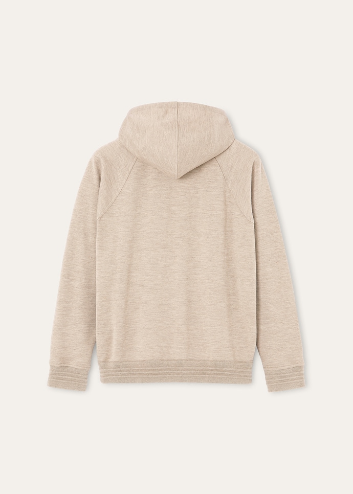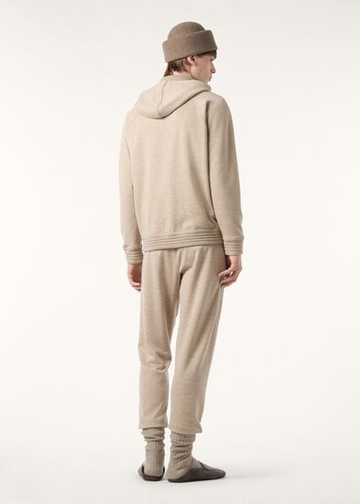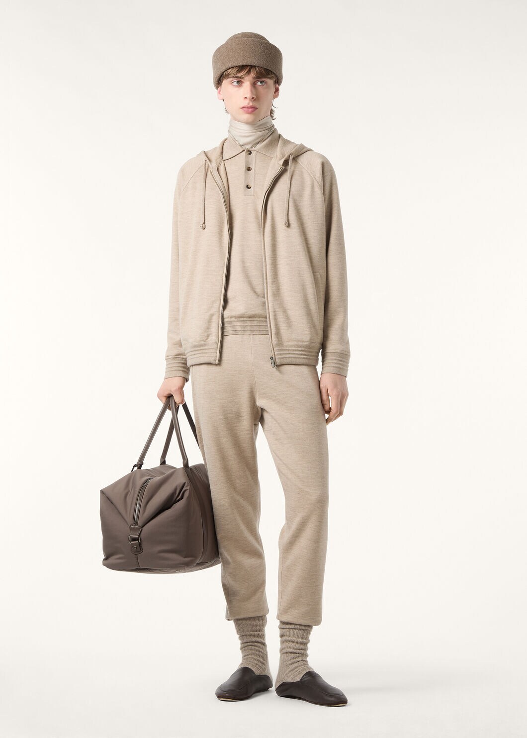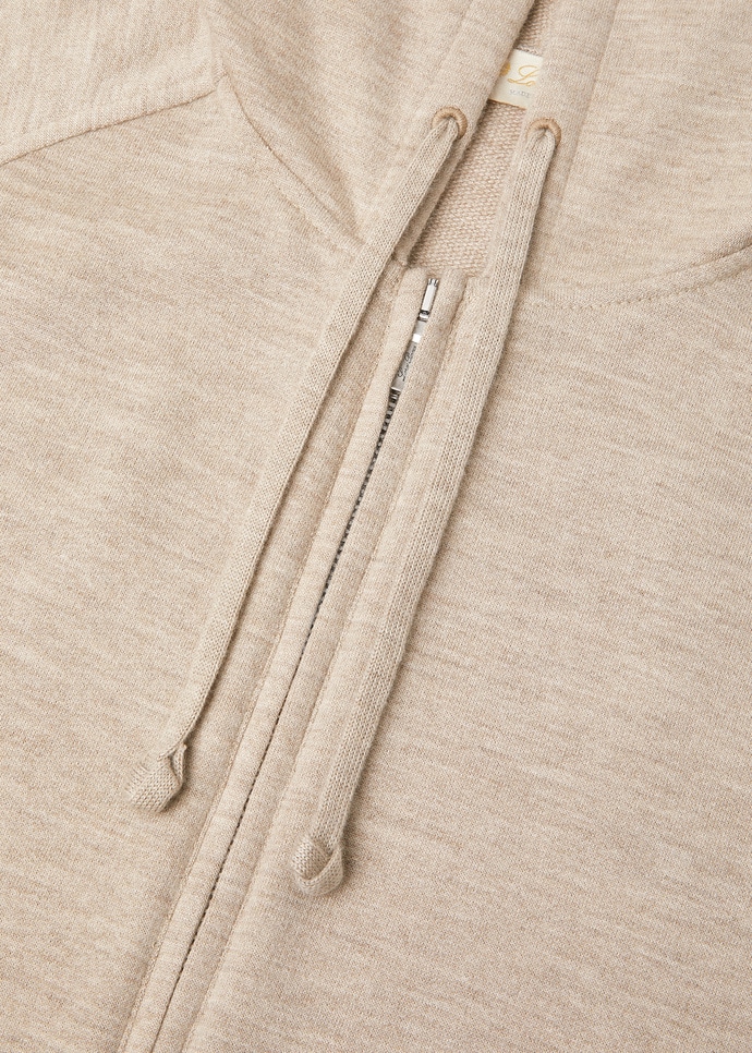 品牌工匠經過長時間的潛心研發,矚目推出此精緻羊絨針織 Sweater 外套。這款外套屬於 Cocooning 系列,以未經染色的纖維製成,具有極其柔軟的質感。此珍稀原料亦用於製作抽繩,其末端綴有柔美結飾。